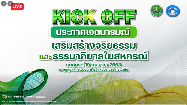 วันที่ 19 กันยายน 2568 นายสหนณ ชัยจรินันท์ สหกรณ์จังหวัดสระบุรี มอบหมายให้นายอำพล ทองเกษร นักวิชาการสหกรณ์ชำนาญการพิเศษ พร้อมด้วยข้าราชการ พนักงานราชการ และลูกจ้างประจำ เข้าร่วมกิจกรรม Kick Off โครงการประกาศเจตนารมณ์จริยธรรมและธรรมาภิบาลในการดำเนินงานของสหกรณ์ ผ่านระบบ Zoom Meeting ณ ห้องประชุมสำนักงานสหกรณ์จังหวัดสระบุรี โดยมีนายวิศิษฐ์ ศรีสุสรรณ์ อธิบดีกรมส่งเสริมสหกรณ์ เป็นประธานในกิจกรรมครั้งนี้ ซึ่งมีวัตถุประสงค์เพื่อสร้างความเข้าใจของสหกรณ์นอกภาคการเกษตรร่วมกันในเป้าหมายให้สหกรณ์ดำเนินธุรกิจอย่างมีธรรมาภิบาลและพัฒนาสหกรณ์นอกภาคการเกษตรให้มีการบริหารจัดการที่ดี